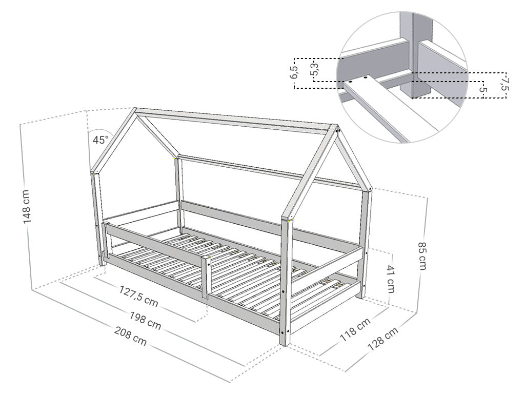 Aus massivem, PEFC-zertifiziertem Fichtenholz gefertigt und mit wasserbasierten, unbedenklichen Farben veredelt, steht FENNA für langlebige Qualität und ein natürliches Raumklima. Das Dach beginnt ab 85 cm, die Gesamthöhe von 150 cm passt perfekt in viele Kinderzimmer und lässt viel Platz für Fantasie – ob mit Lichterketten, Vorhängen oder Kissenwelten.