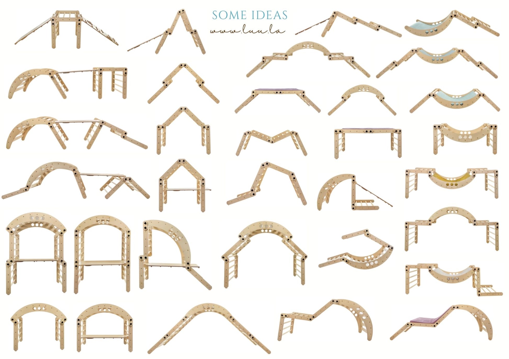 Mit Hilfe von vier speziellen Verbindungsteilen können die Seiten des Dreiecks in der Länge verändert werden, wodurch verschiedene geometrische Kombinationen je nach Alter und Vorlieben der Kinder entstehen - es kann höher / niedriger, komplizierter / einfacher sein. Die Verbindung sorgt auch für zusätzliche Stabilität, wenn sie aktiv genutzt wird. Die Verbindungslösung ermöglicht es auch, die Struktur leicht zu falten und so Platz zu sparen.