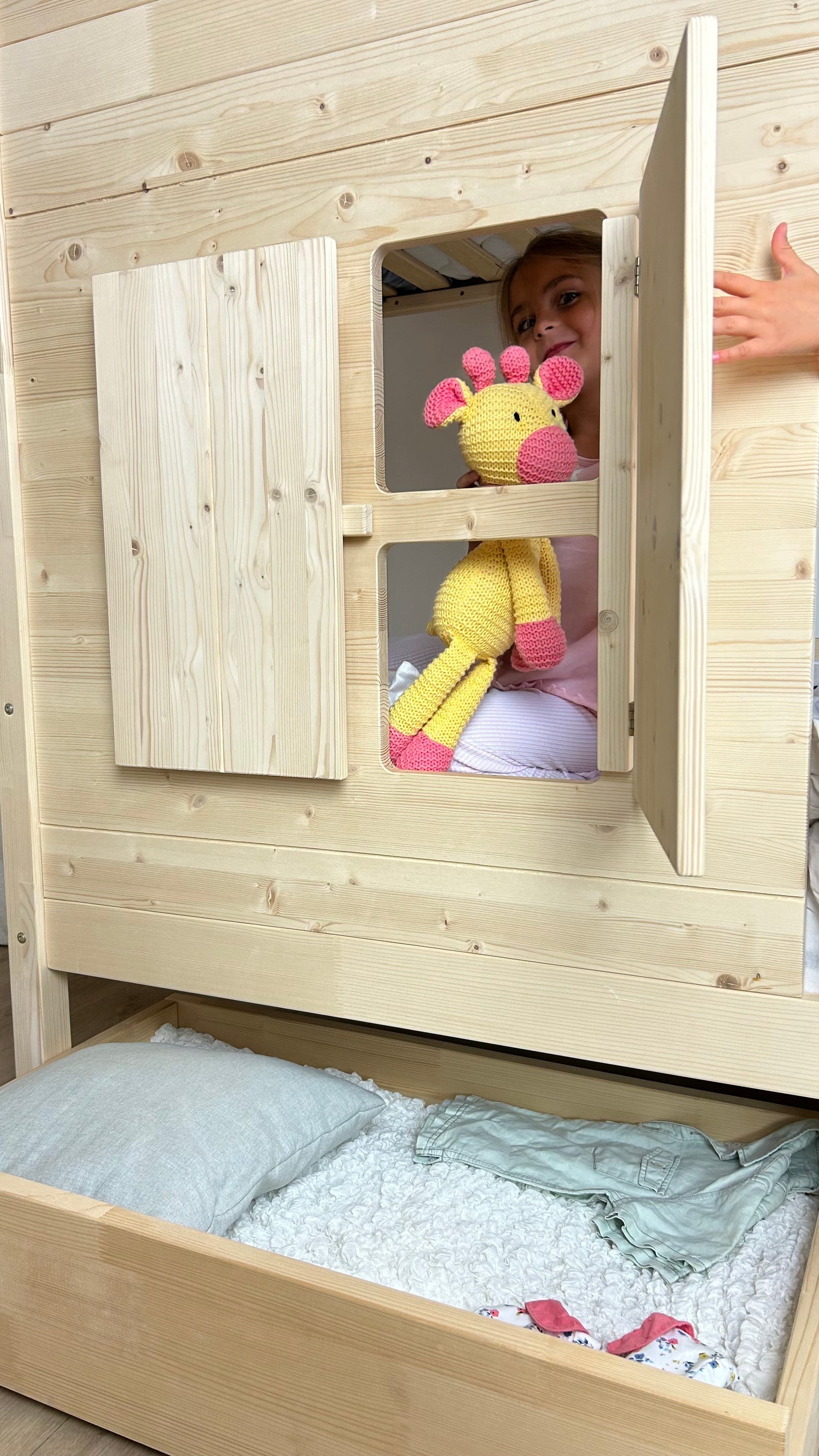 Während unten schon die Kleinsten (ab 3 Jahren) ihr Reich finden, wartet oben ein kuscheliger Schlafplatz für kleine Abenteurer ab 6 Jahren. Durch die Form eines kleinen Ferienhauses entsteht eine warme, vertraute Atmosphäre, die Kindern ein Gefühl von Sicherheit gibt – perfekt zum Schlafen, Träumen und Spielen.