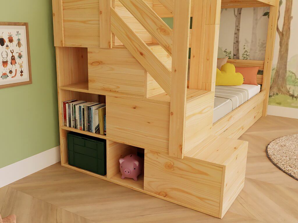 Statt einer klassischen Leiter führen dich hier praktische Stufen hinauf in die obere Etage. Jede Stufe ist Teil eines intelligenten Regalsystems mit Schubladen, das nicht nur den Aufstieg besonders sicher macht, sondern gleichzeitig wertvollen Stauraum schafft. So finden Lieblingsbücher, Spielzeug oder Kuscheldecken ihren Platz – ordentlich verstaut und immer griffbereit.