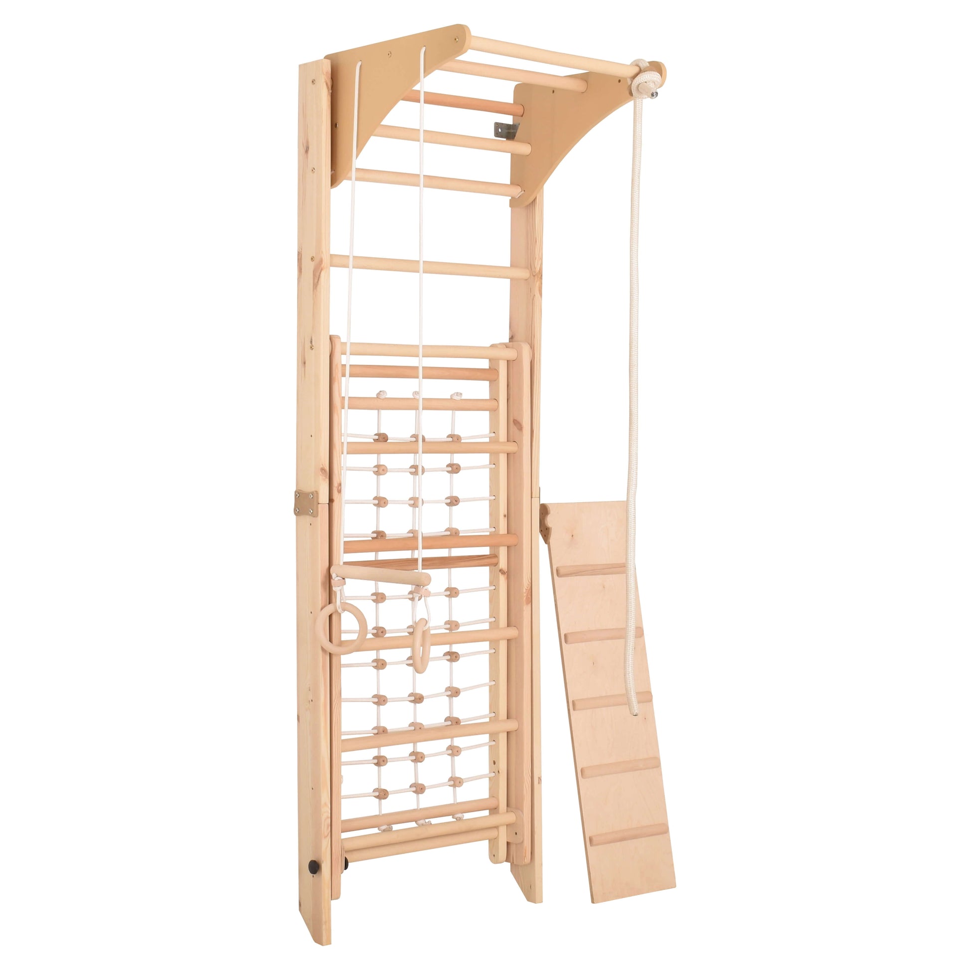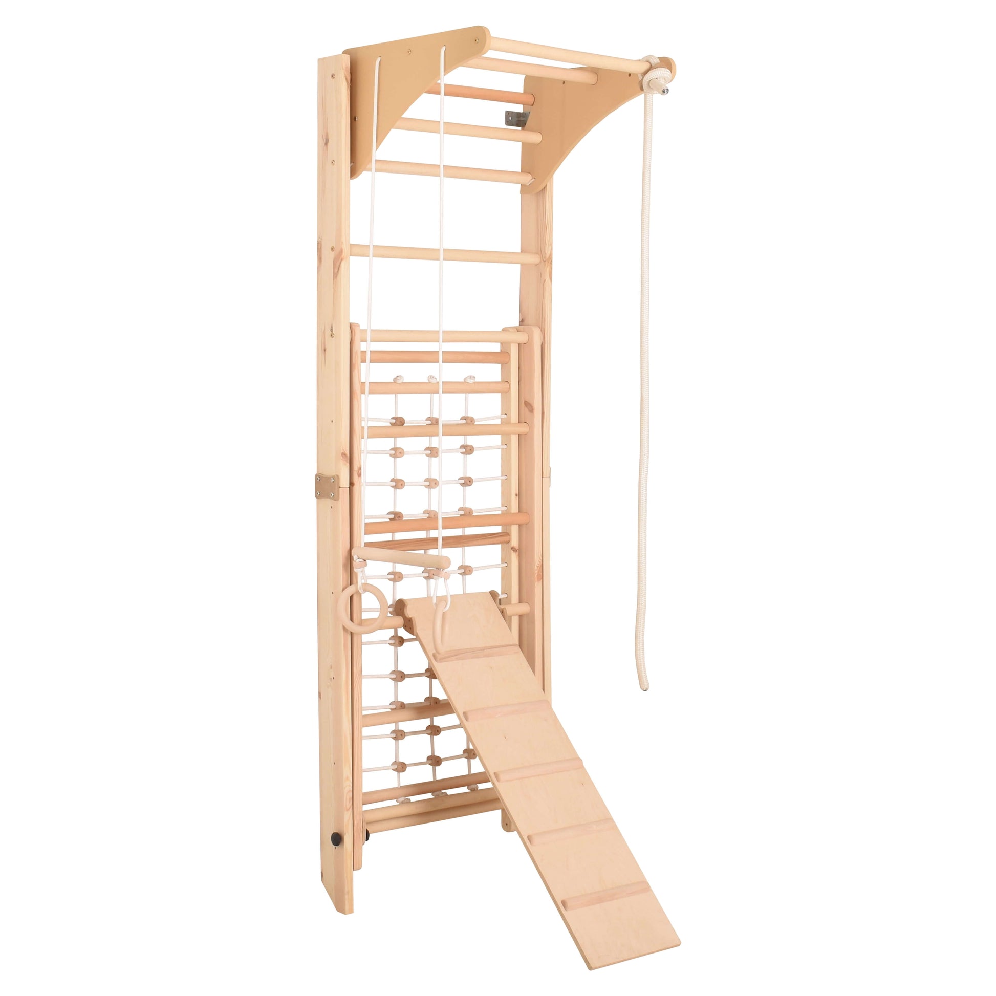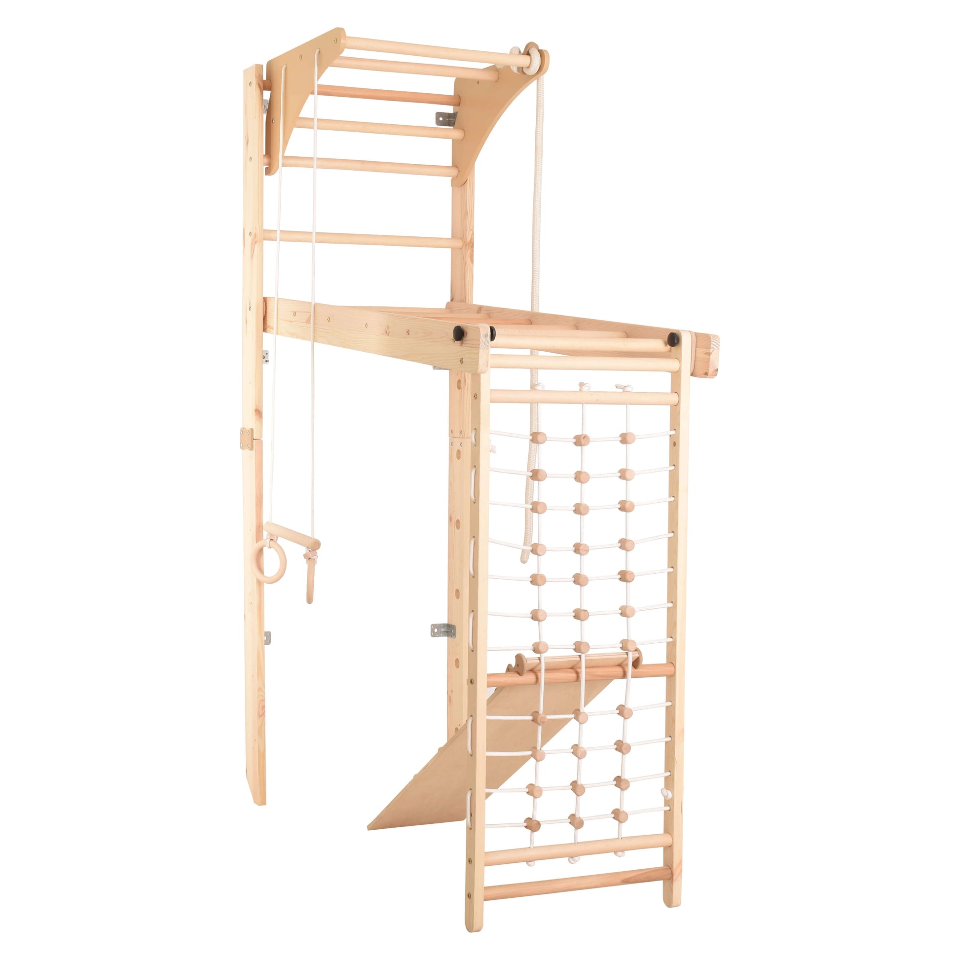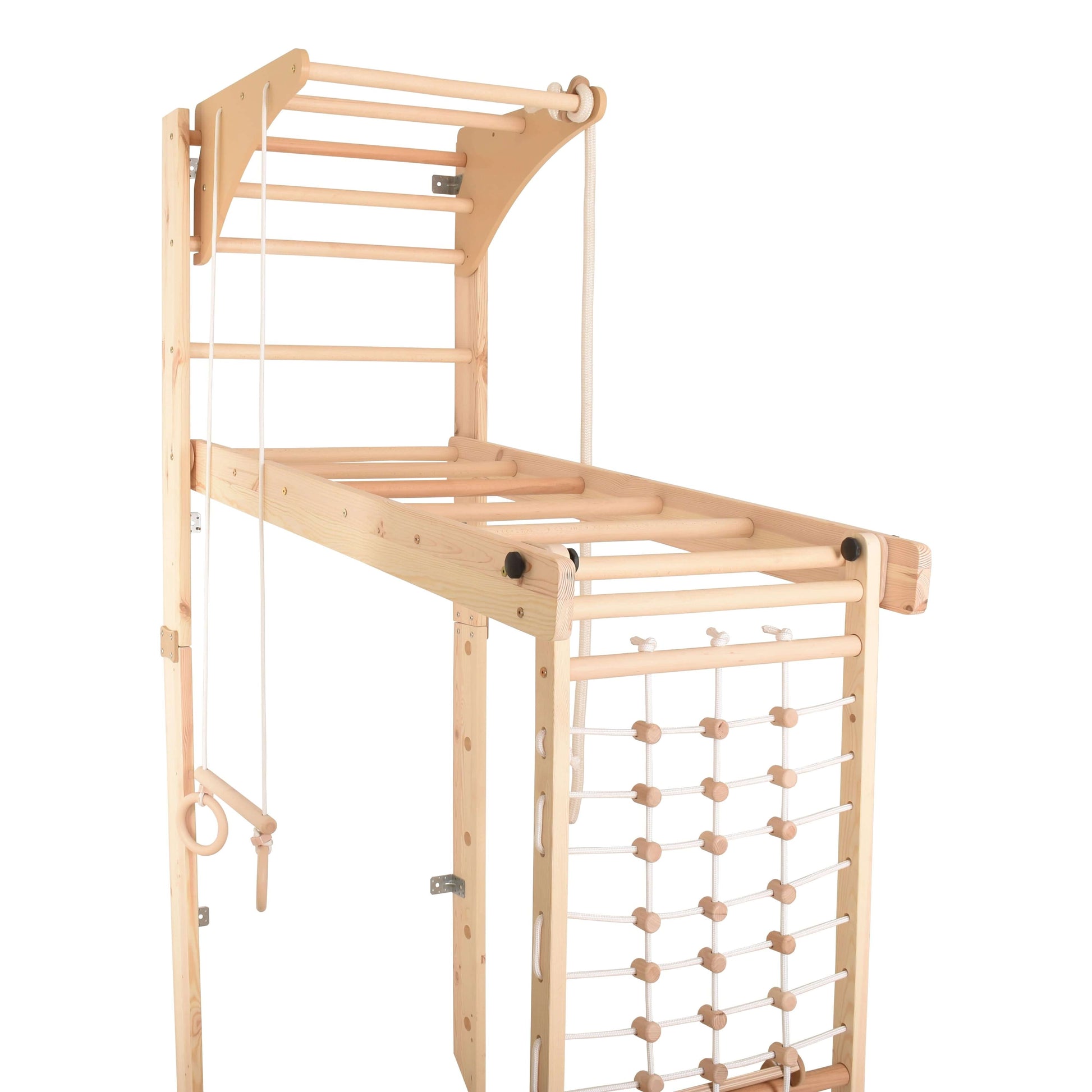 Entdecke die unendlichen Möglichkeiten, die dieses indoor Klettergerüst für Kinderzimmer bietet. Erkunde und spiele gemeinsam mit deinem Kind auf Turnringen, Schwedenleiter, Kletternetz und Rutsche.