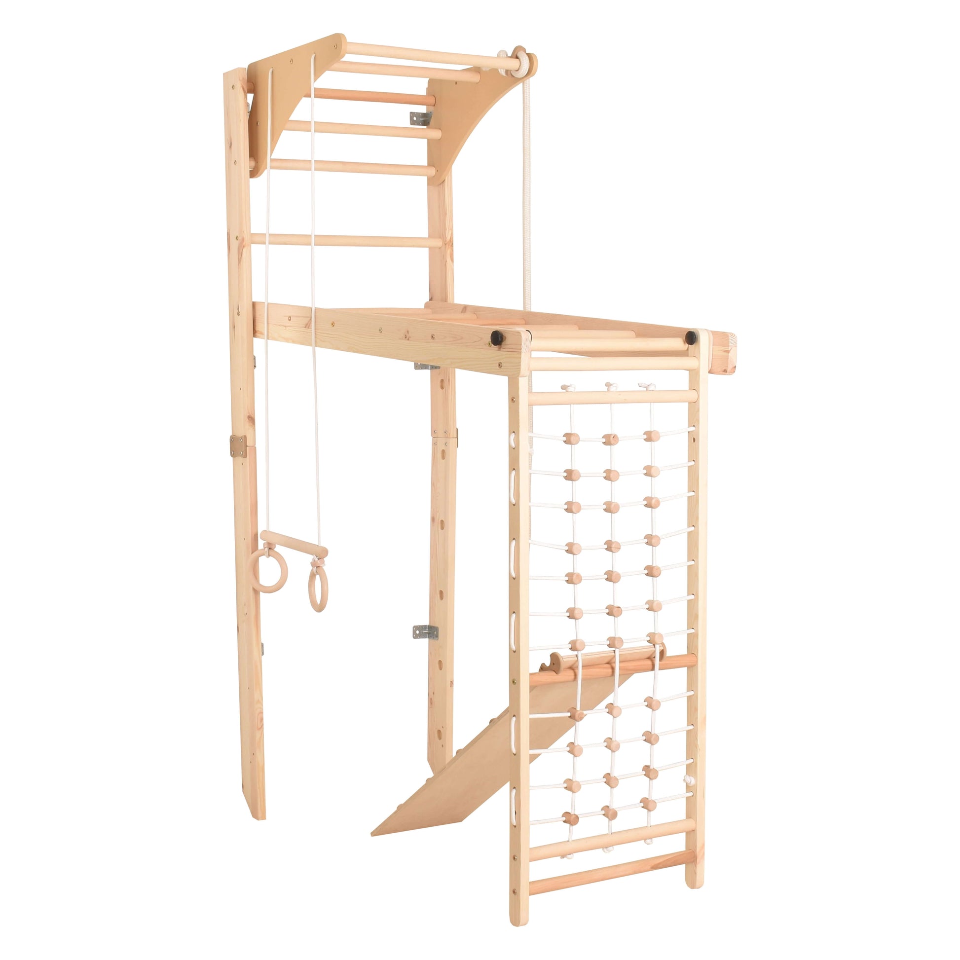 Dieses Klettergerüst für Kinderzimmer bietet deinem Kind endlose Möglichkeiten zum Erkunden und Spielen. Schaukel mit den Turnringen, erklimme die Schwedenleiter oder das Kletternetz und spiele mit der Rutsche.