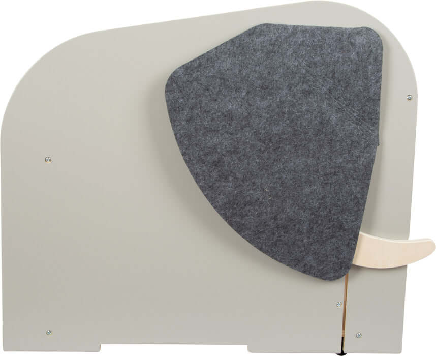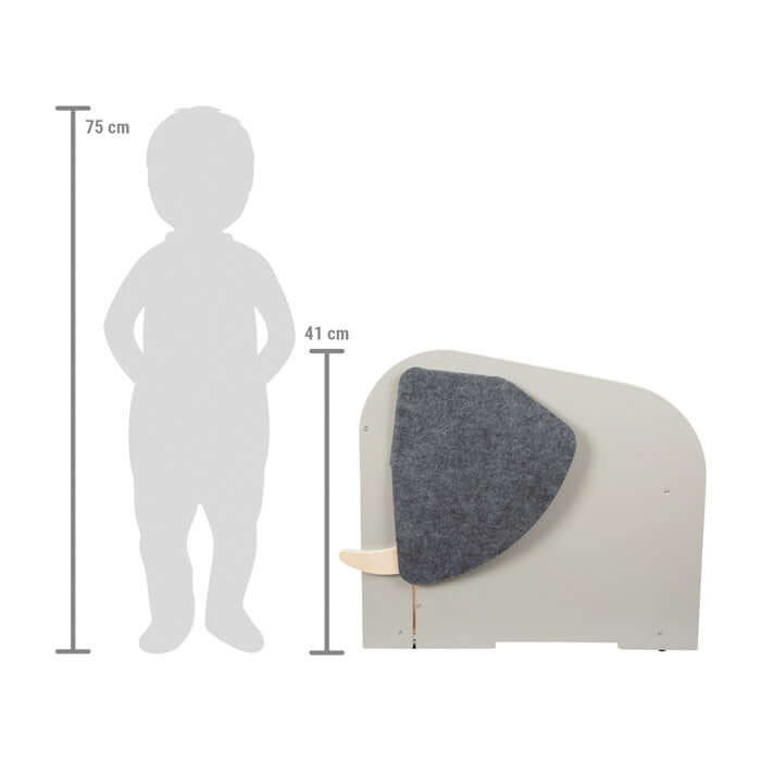 Weitere Details machen die Spielzeugkiste zu einem raffinierten und gleichzeitig praktischen Spielgefährten: Hochwertige Filzohren verdecken die geheimen Öffnungen an beiden Seiten, der drehbare Schwanz des Elefanten dient als praktischer Öffnungs- und Schließmechanismus und durch den Elefantenmund können kleinere Teile in den unteren Stauraum eingeworfen werden. Damit wird die Spielzeugbox garantiert zum Lieblingsstück in jedem Kinderzimmer.