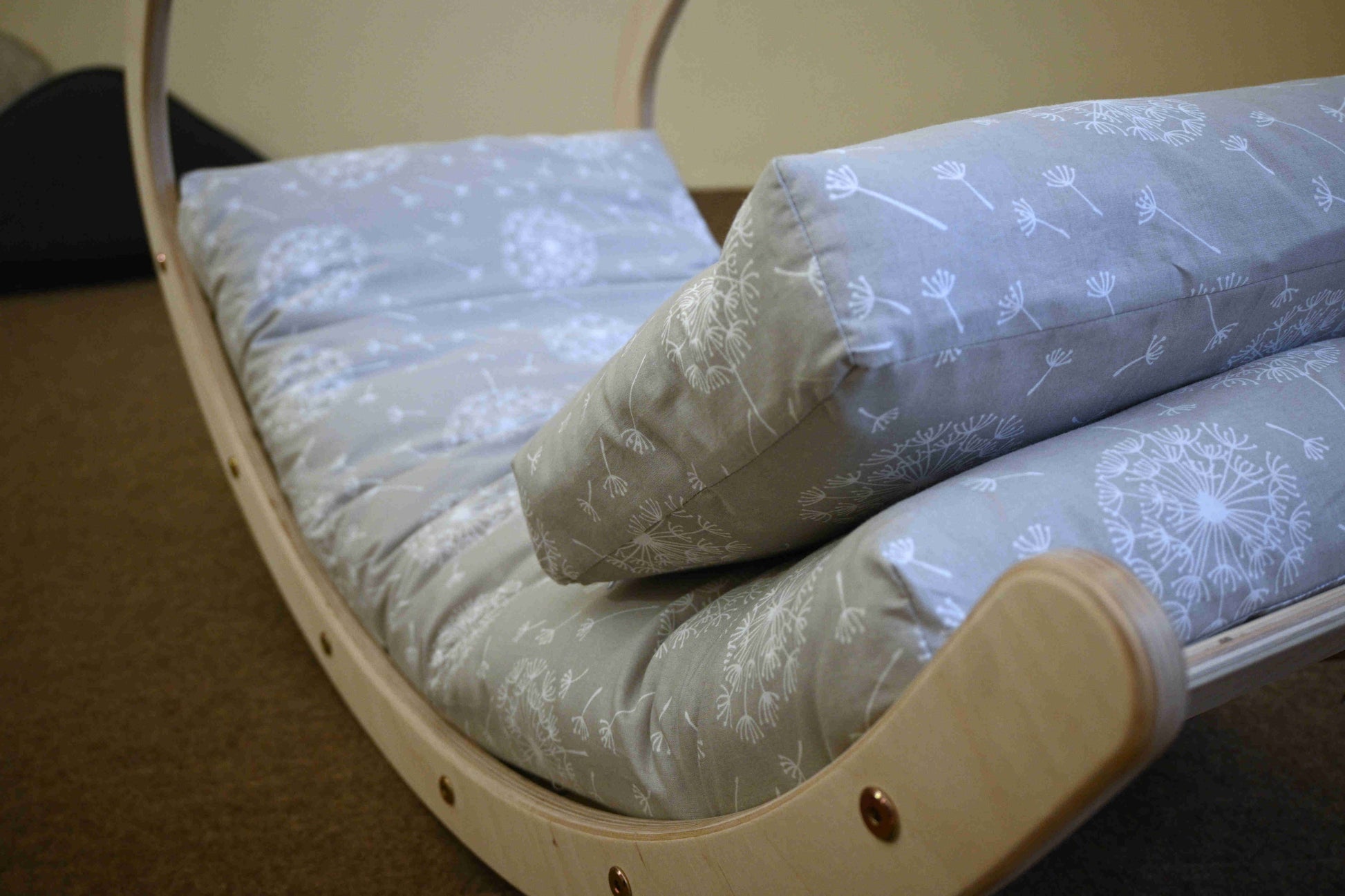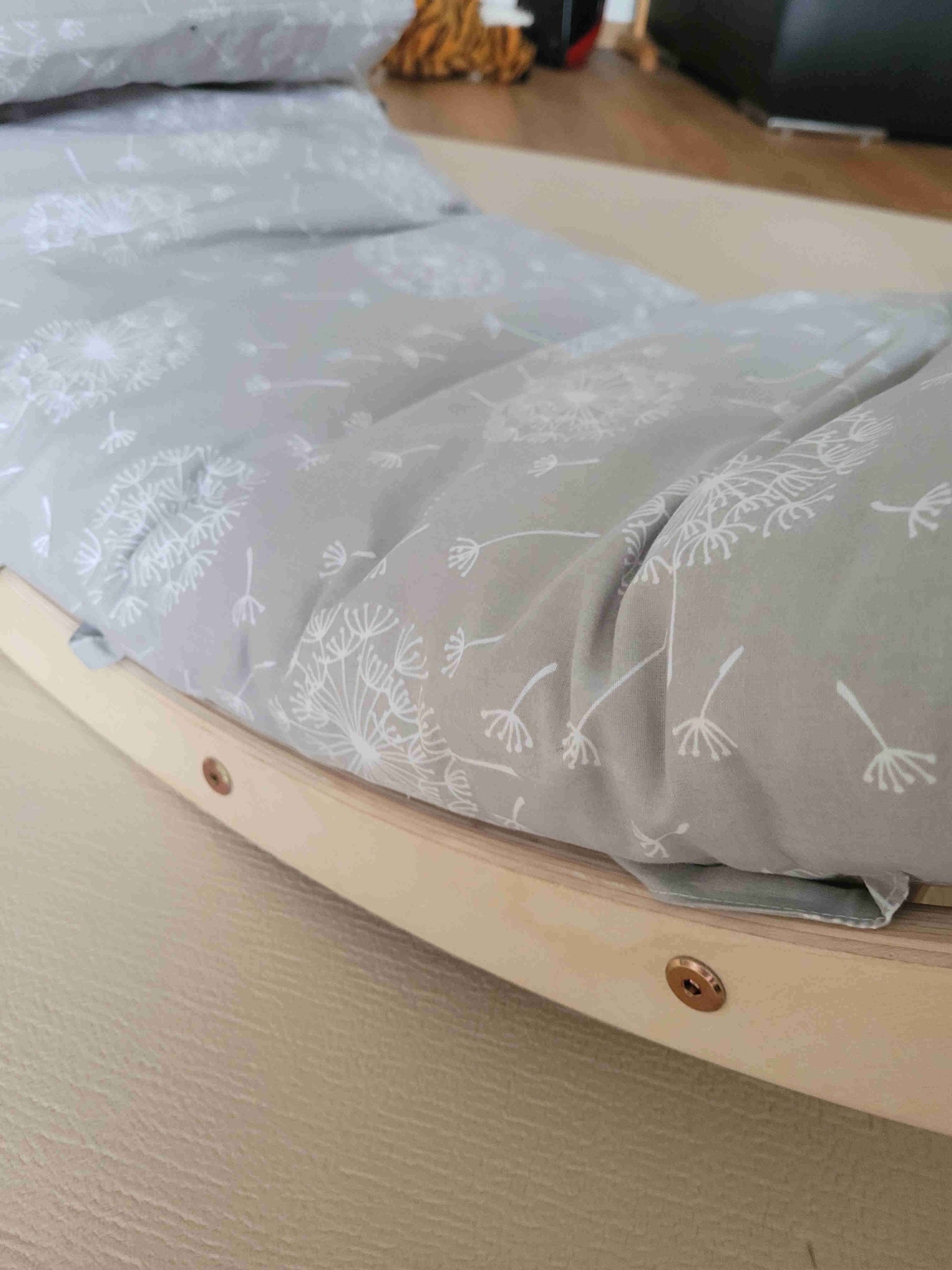 Vor kurzem haben wir die Schnüre der Matratzen entfernt, um zu verhindern, dass die Matratze reißt - Hintergrund: in der Vergangenheit konnte man die Matratze mit Schnüren am Bogen festmachen (wie aktuell noch auf dem Bild zu sehen), und wenn sie dann umgedreht wird und das Kind darüber klettert, kann das Bein des Kindes vom Rundstab abrutschen und das Kind steht am Ende auf der umgedrehten, gebundenen Matratze. Somit haben die Schnüre einen Riss im Stoff verursacht, weil die Nähte das Gewicht des Kindes nicht halten können.
