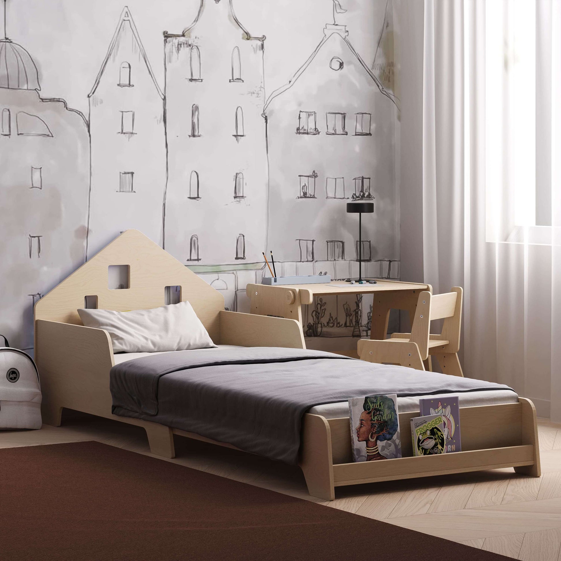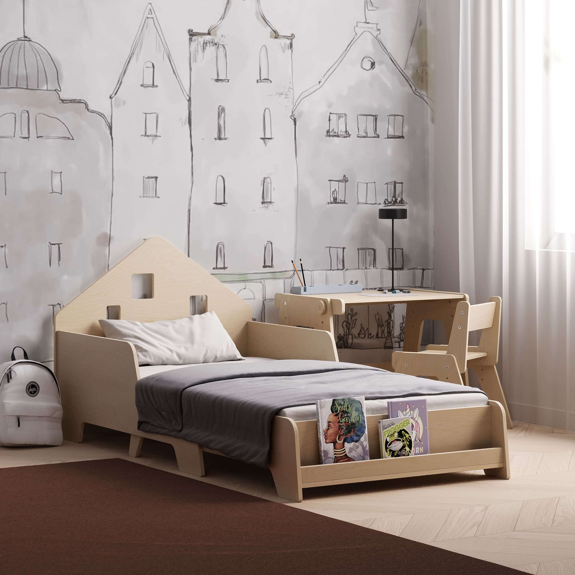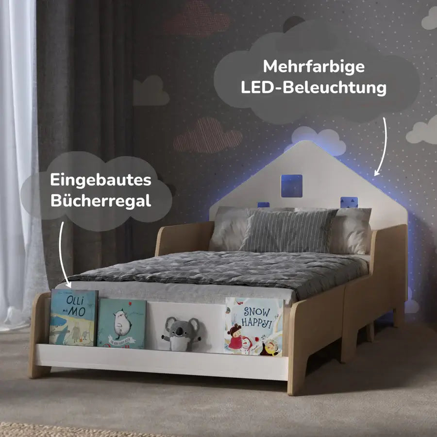 Das Kopfteil in Form eines Hauses schafft eine Atmosphäre der Gemütlichkeit und Sicherheit, und die mehrfarbige LED-Beleuchtung verleiht dem Kinderzimmer Magie und Verspieltheit.