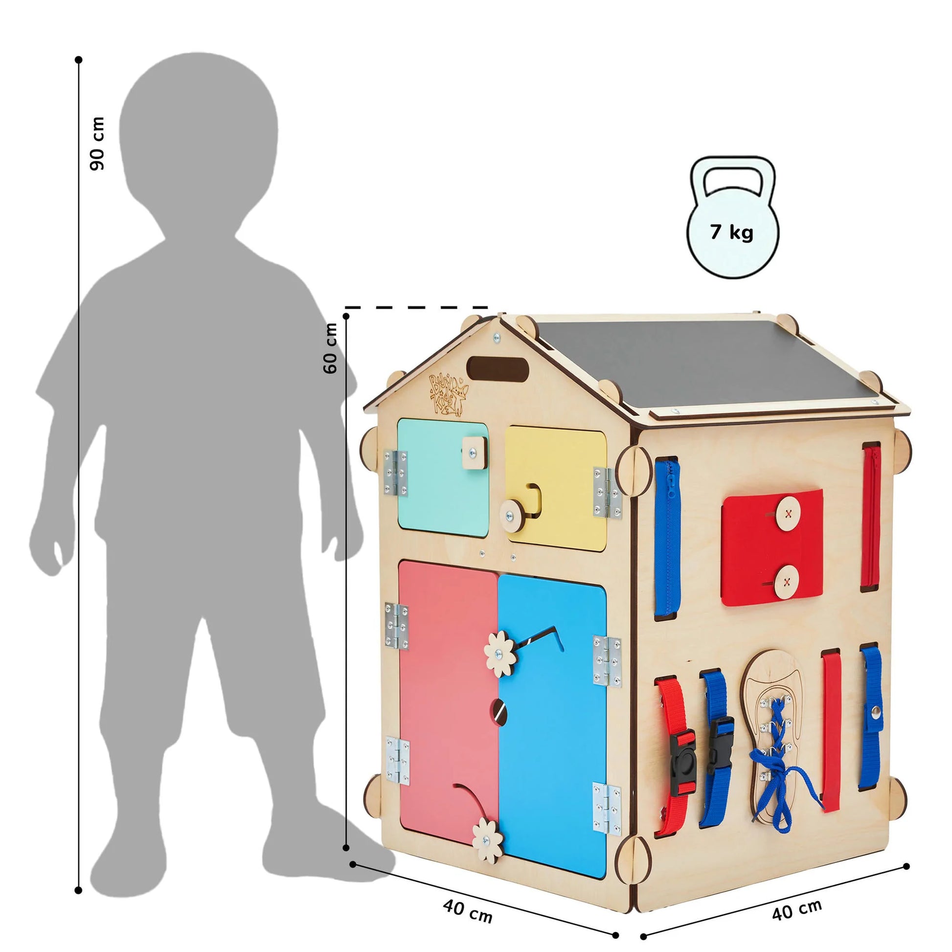 Viele Aktivitäten konzentrieren sich auf das Training der Finger und die Entwicklung der Feinmotorik, was bei den heutigen Kindern, die von Tablets und Handys umgeben sind, vernachlässigt wird. Bei diesen Aktivitäten lernt das Kind auch Geduld und Konzentration. Das Haus hilft auch bei der Entwicklung des logischen Denkens und der kreativen Fähigkeiten, und dank seiner Form ist es auch ein großartiger Partner für das Erfinden verschiedener Geschichten. Es lebe die Phantasie der Kinder.