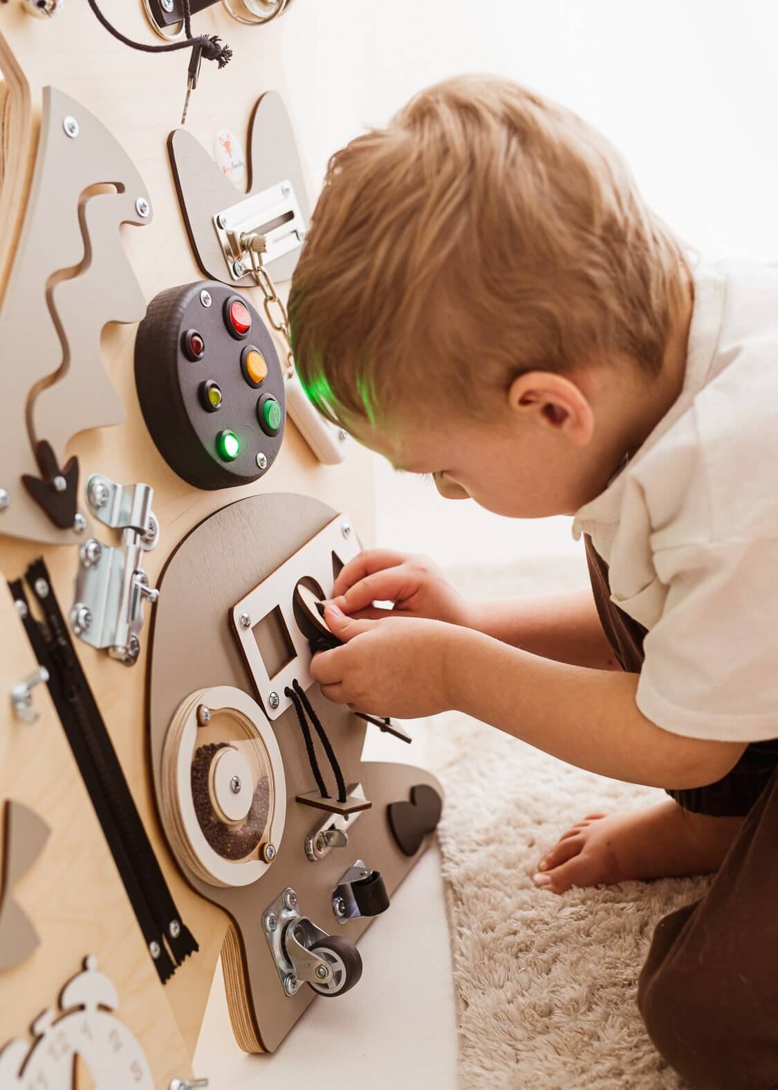 Auf dem großen Motorikboard (77 × 76 cm) warten 20 abwechslungsreiche Spielelemente, die Feinmotorik, Konzentration und Selbstständigkeit fördern: