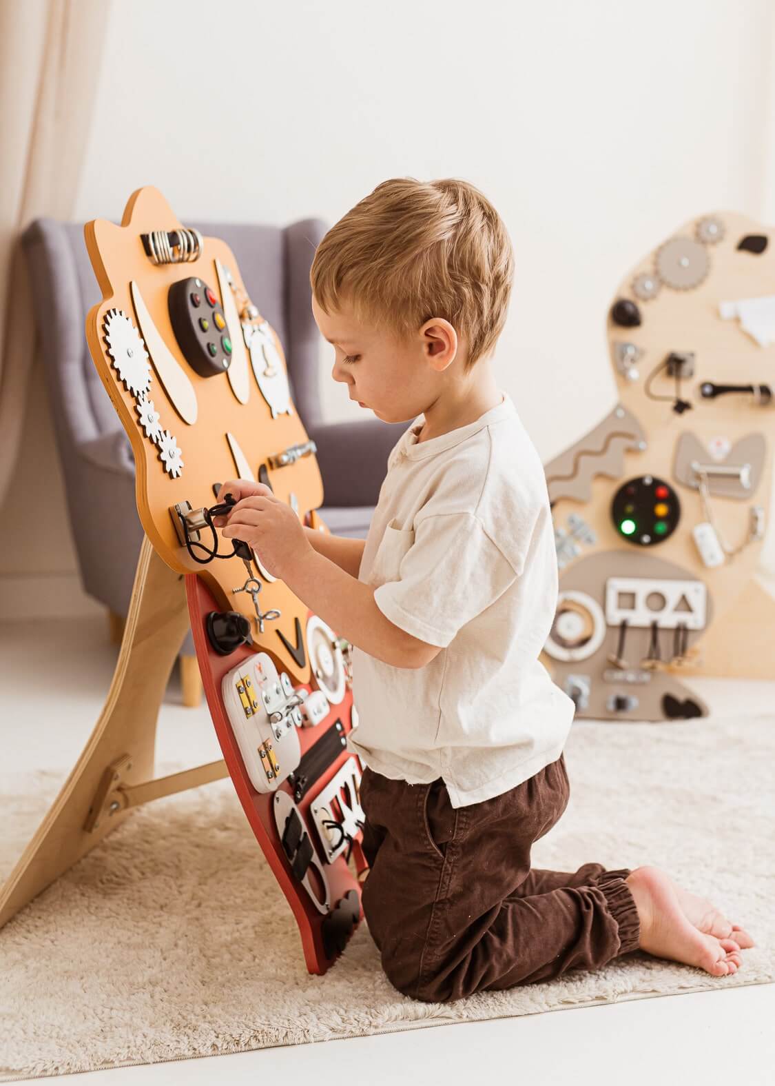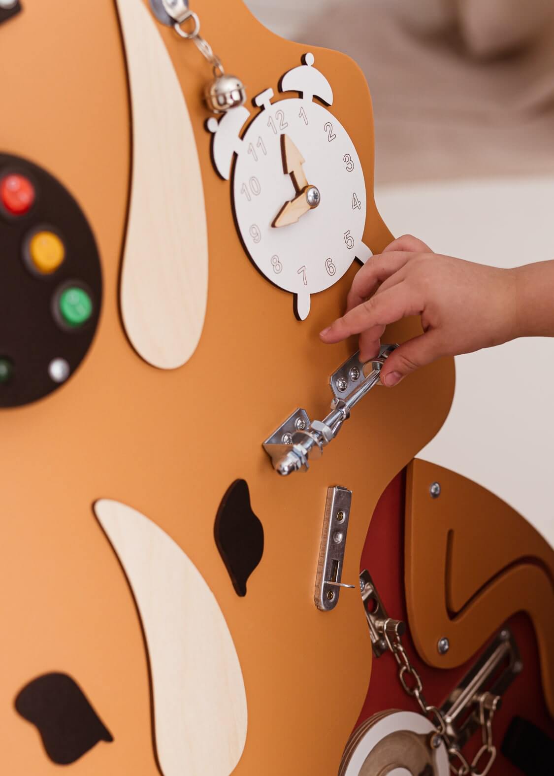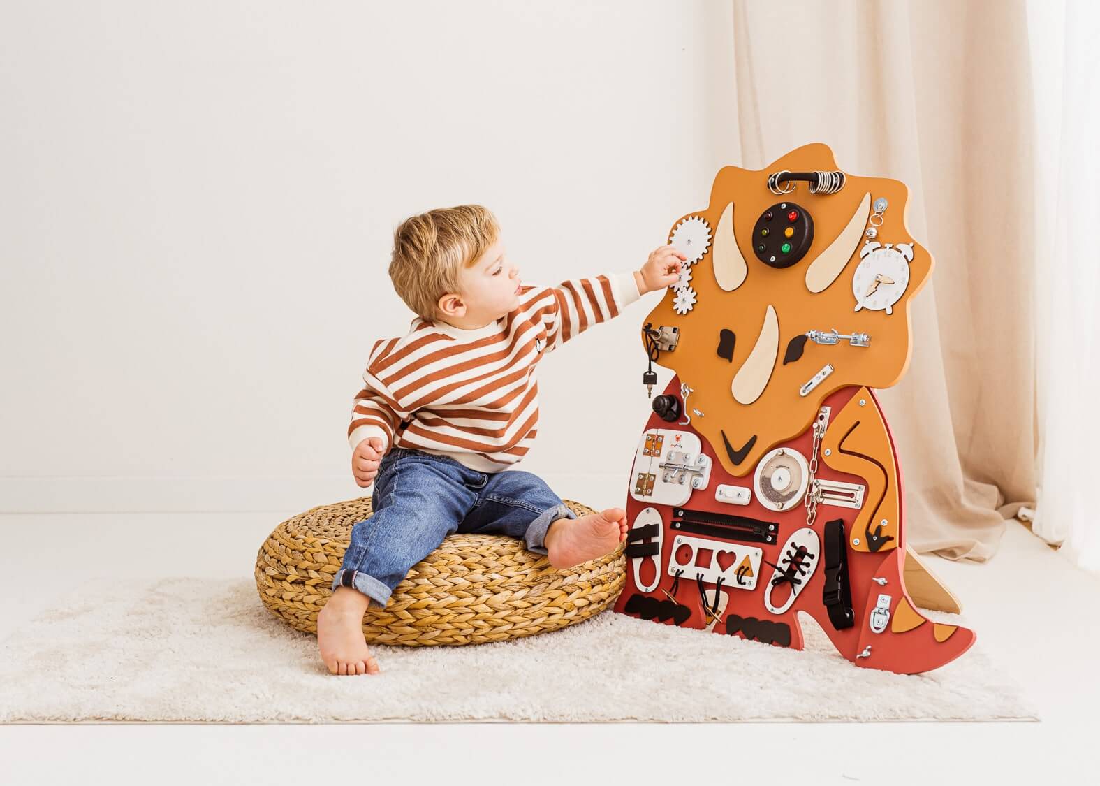 Auf dem großen Motorikboard (80 × 70 cm) warten 23 abwechslungsreiche Spielelemente, die Feinmotorik, Konzentration und Alltagskompetenzen fördern: