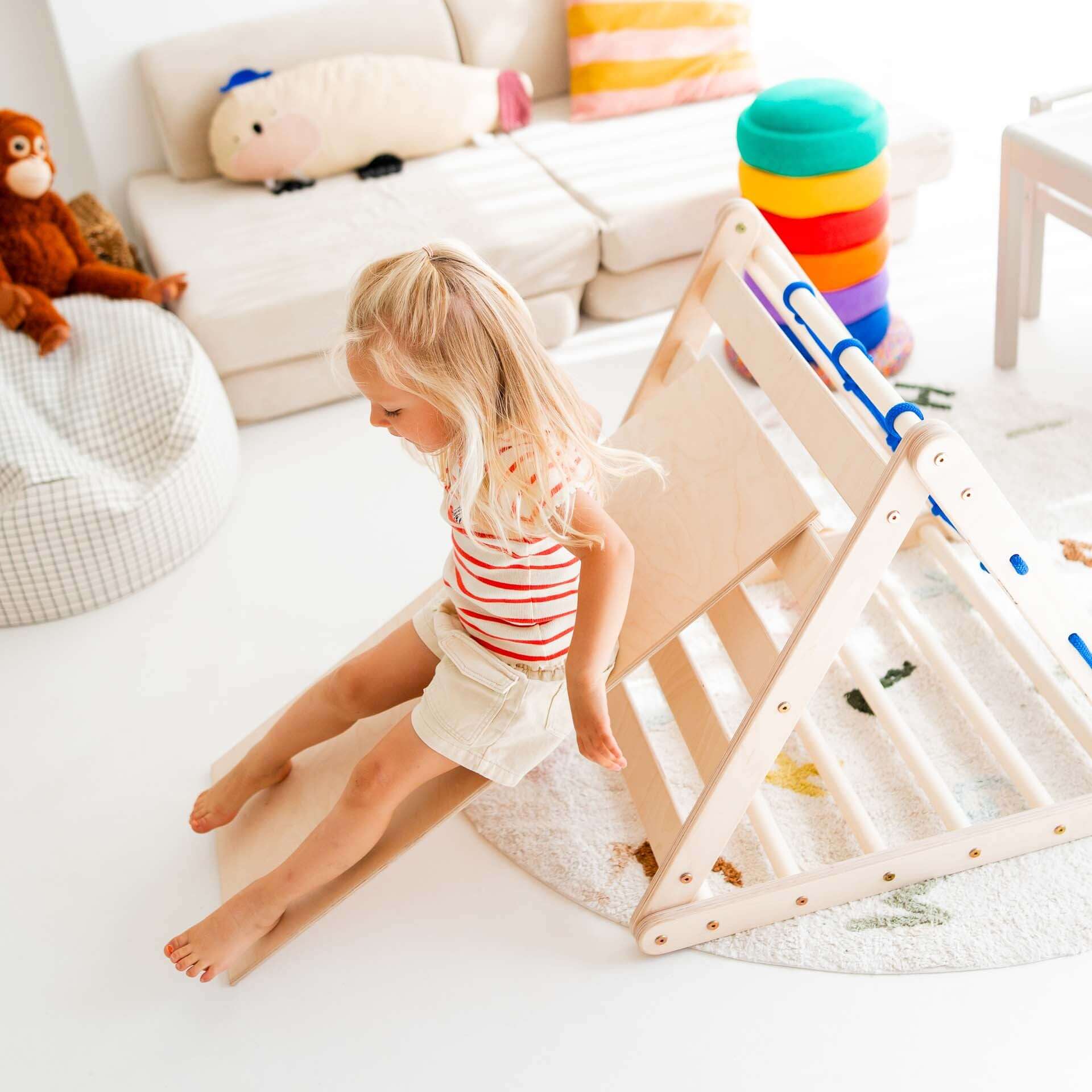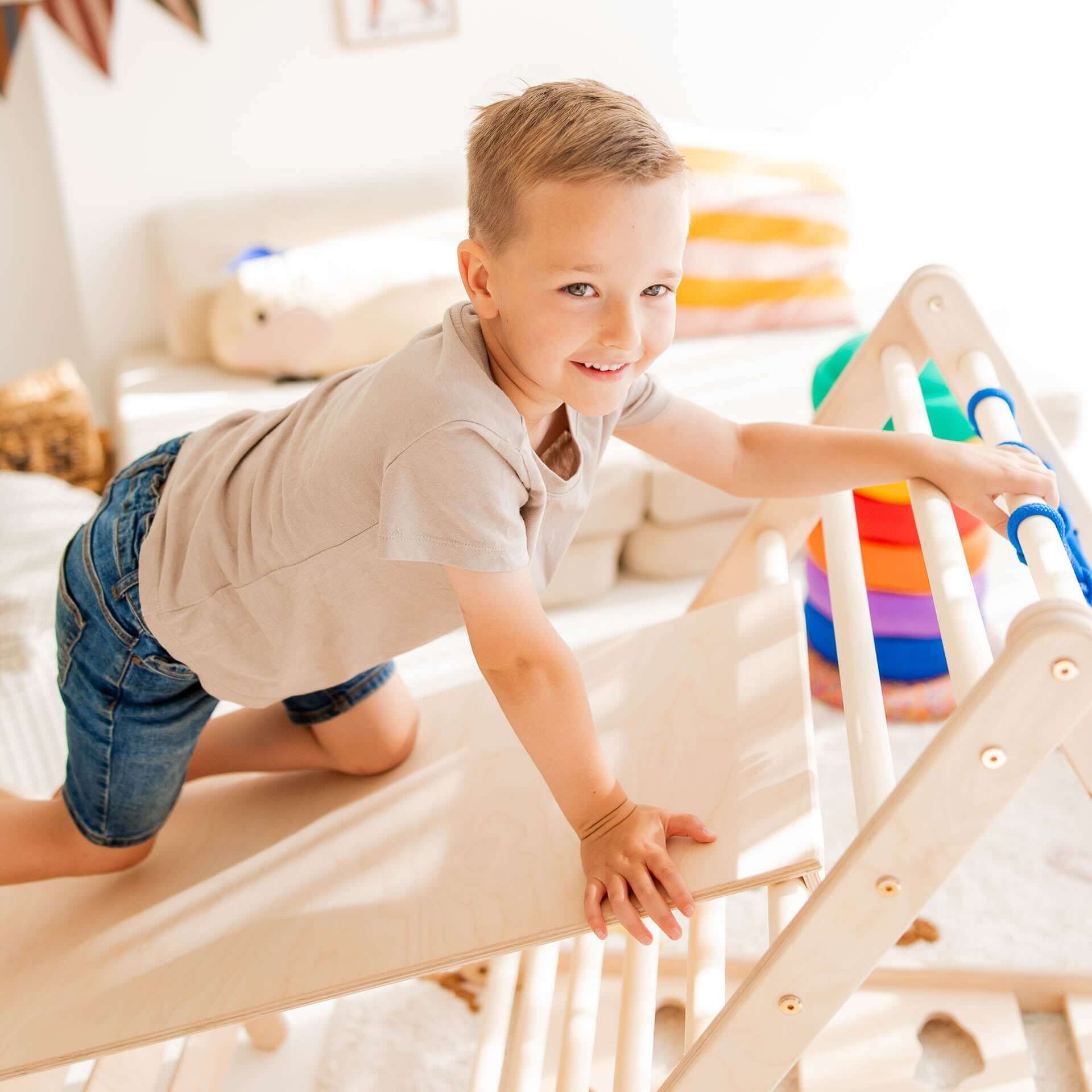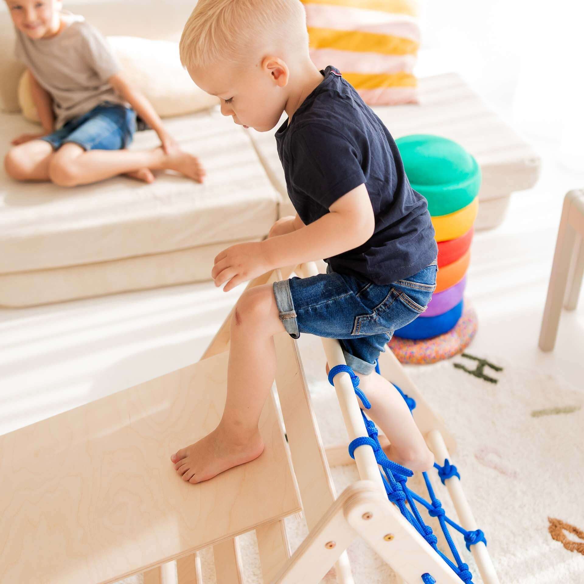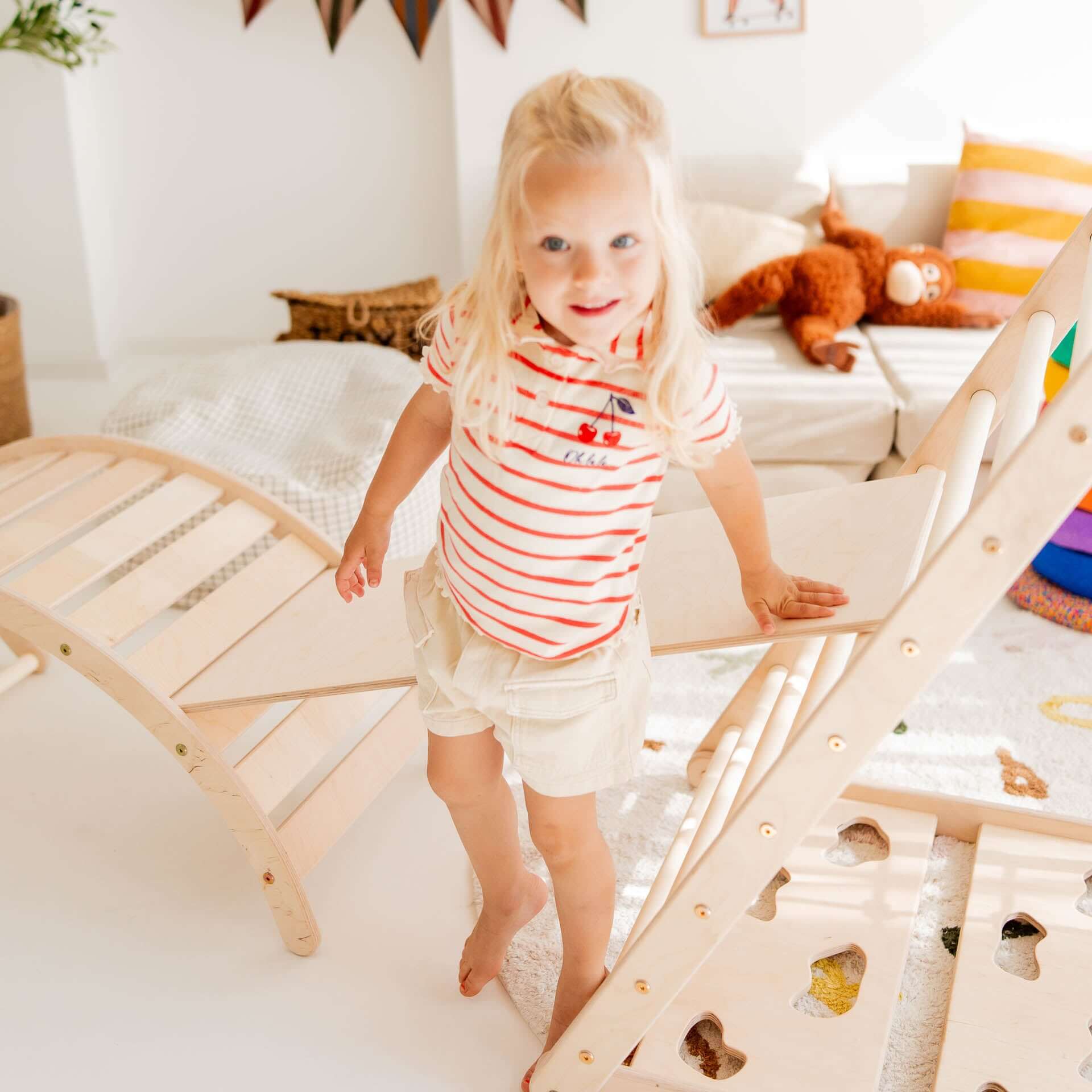 Exemplarisch ist das Rutschbrett auf den Bilder mit passenden Kletterdreiecken und Kletterbögen zu sehen.