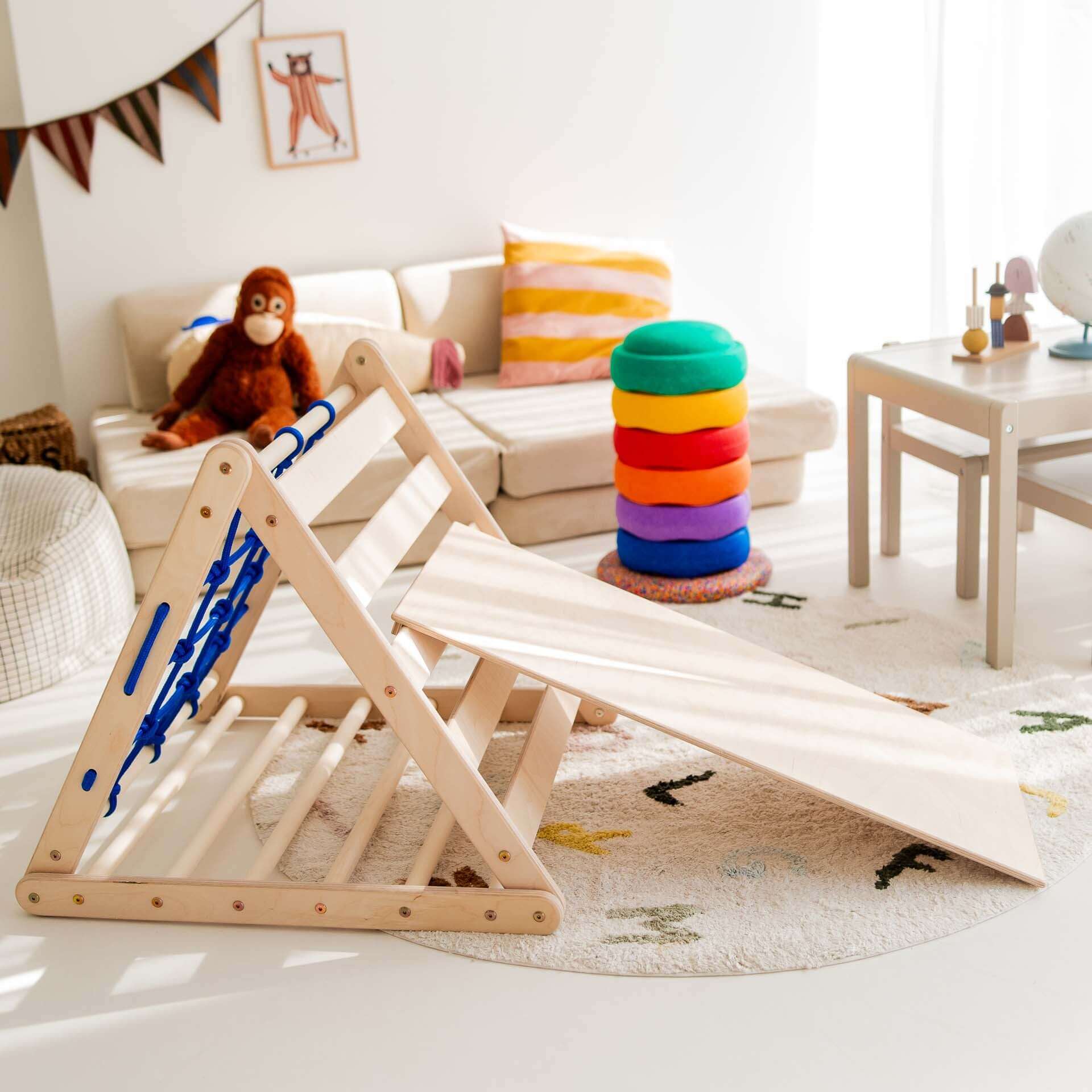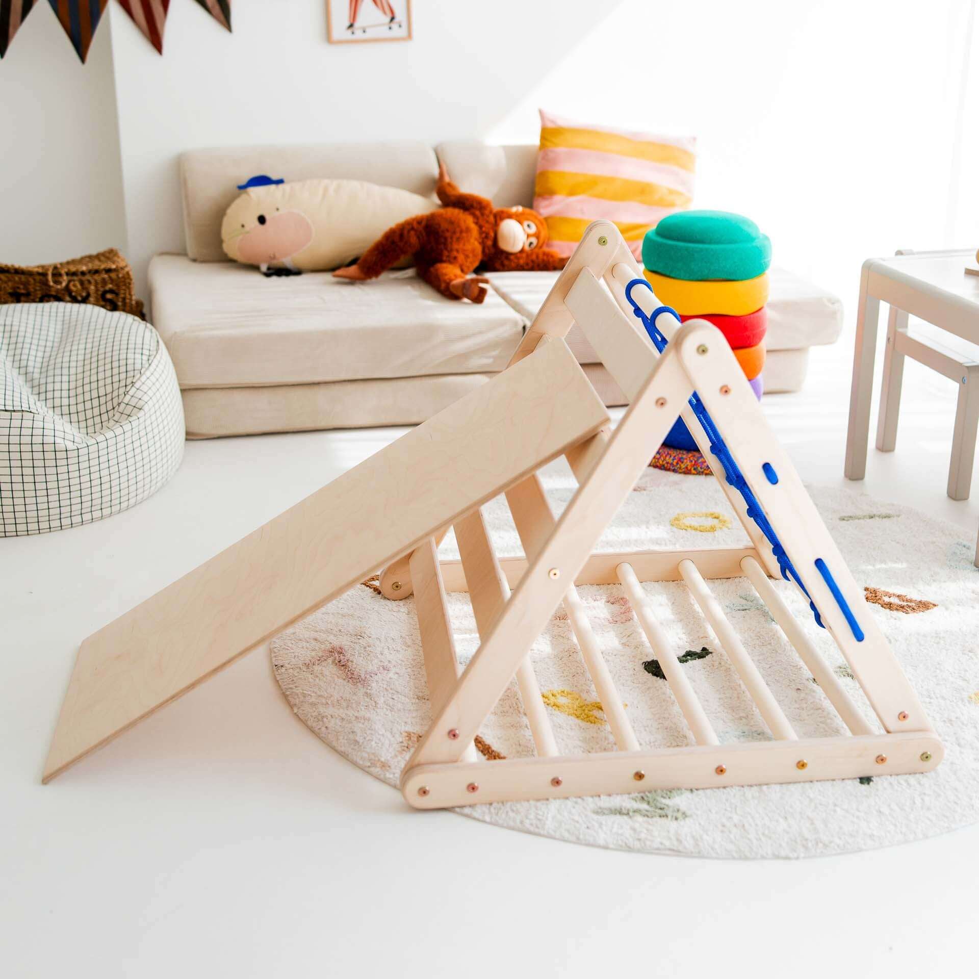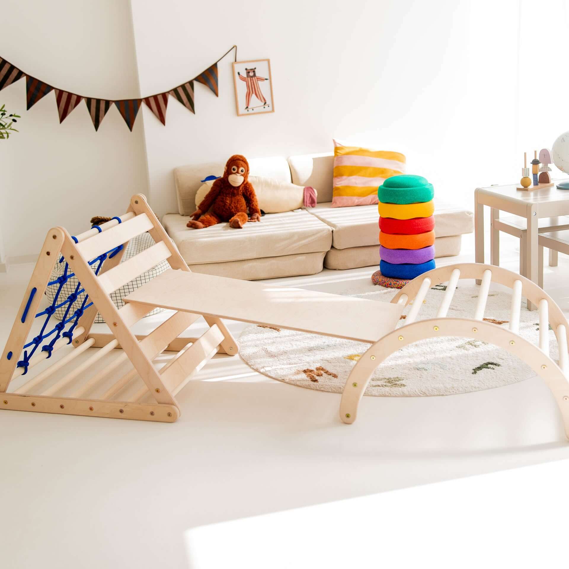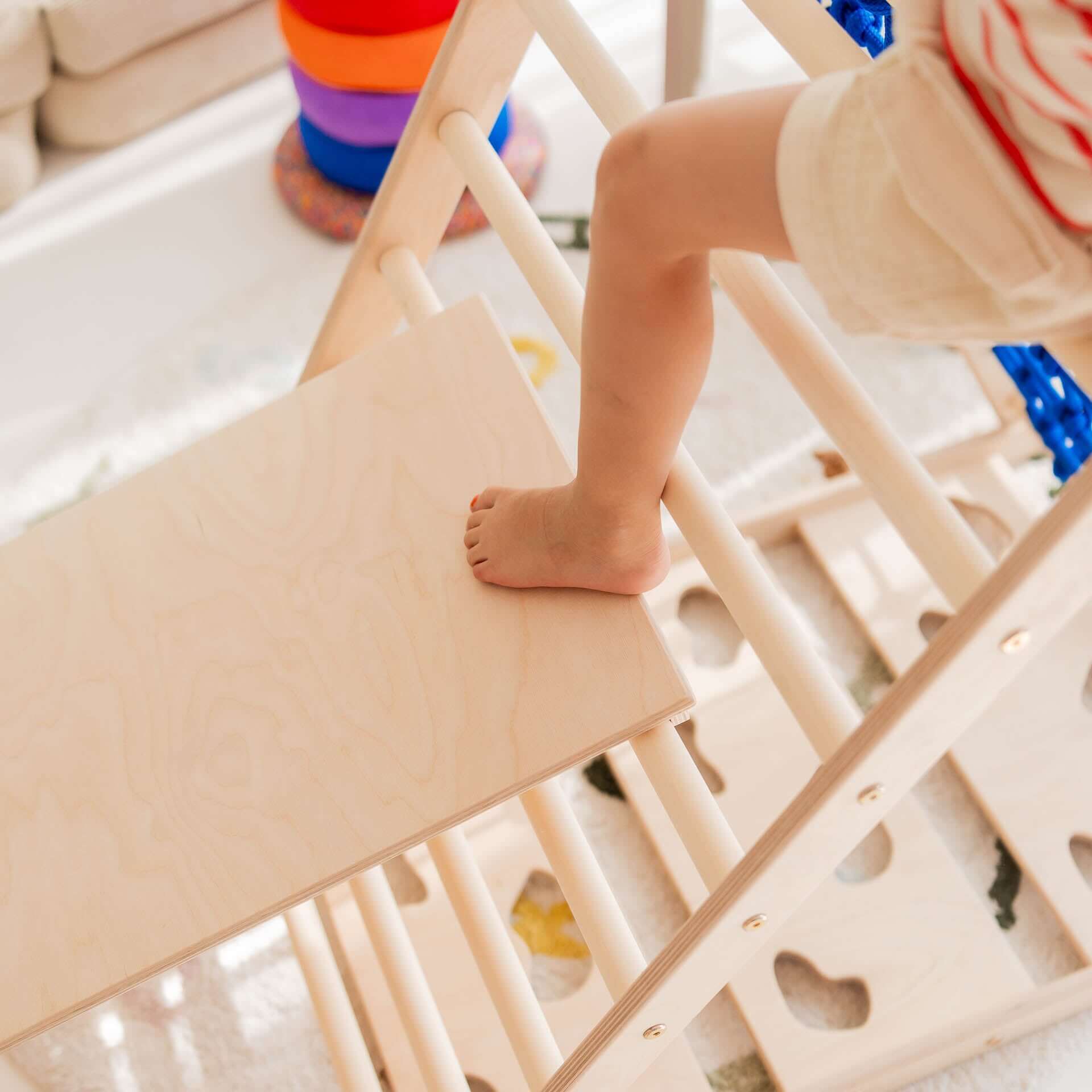 Exemplarisch ist das Rutschbrett auf den Bilder mit passenden Kletterdreiecken und Kletterbögen zu sehen.