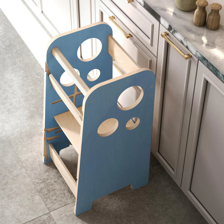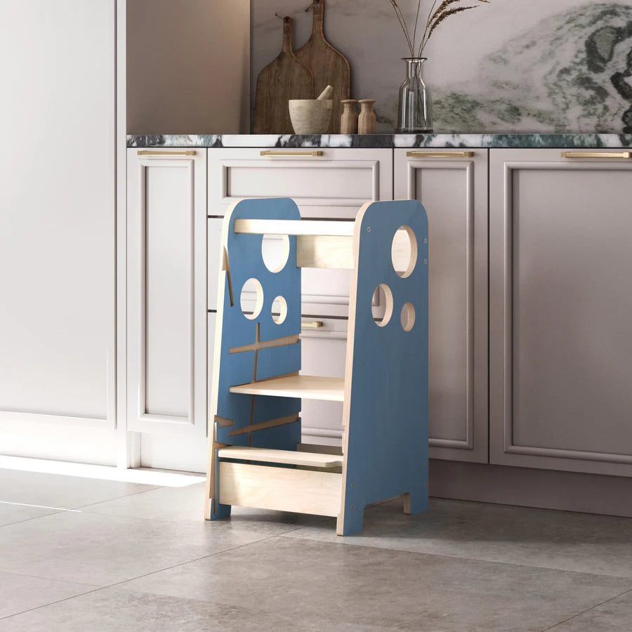 Der Lernturm ist 75 Zentimeter hoch, aber als wachsender Turm ausgedacht – die Plattformhöhe kann in drei Ebenen liegen – damit er dem Kind so lange als möglich dient. Die Seitenteile sind ausreichend hoch und mit verschiedenen Blasen geschmückt.
