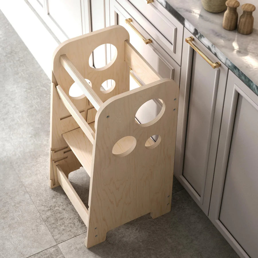 Der wachsende Lernturm ist aus 12 mm starkem Birkensperrholz hergestellt, das glatt bearbeitet ist und keine scharfen Kanten hat. Ein größeres Kind vermag den Turm selbst zu bewegen, doch keine Angst, die Konstruktion ist stabil und trägt 90 kg. Die Oberfläche ist mit farblosem wasserlöslichem Lack behandelt und kratzfest. Das natürliche Aussehen eignet sich für jede Art Inneneinrichtung.