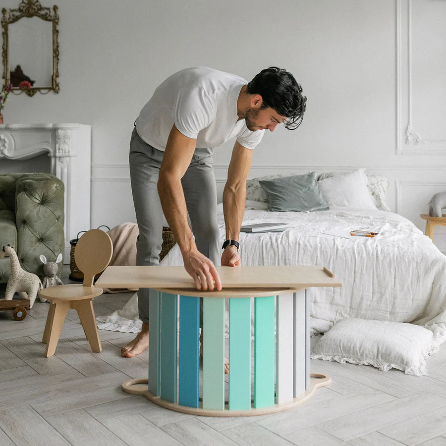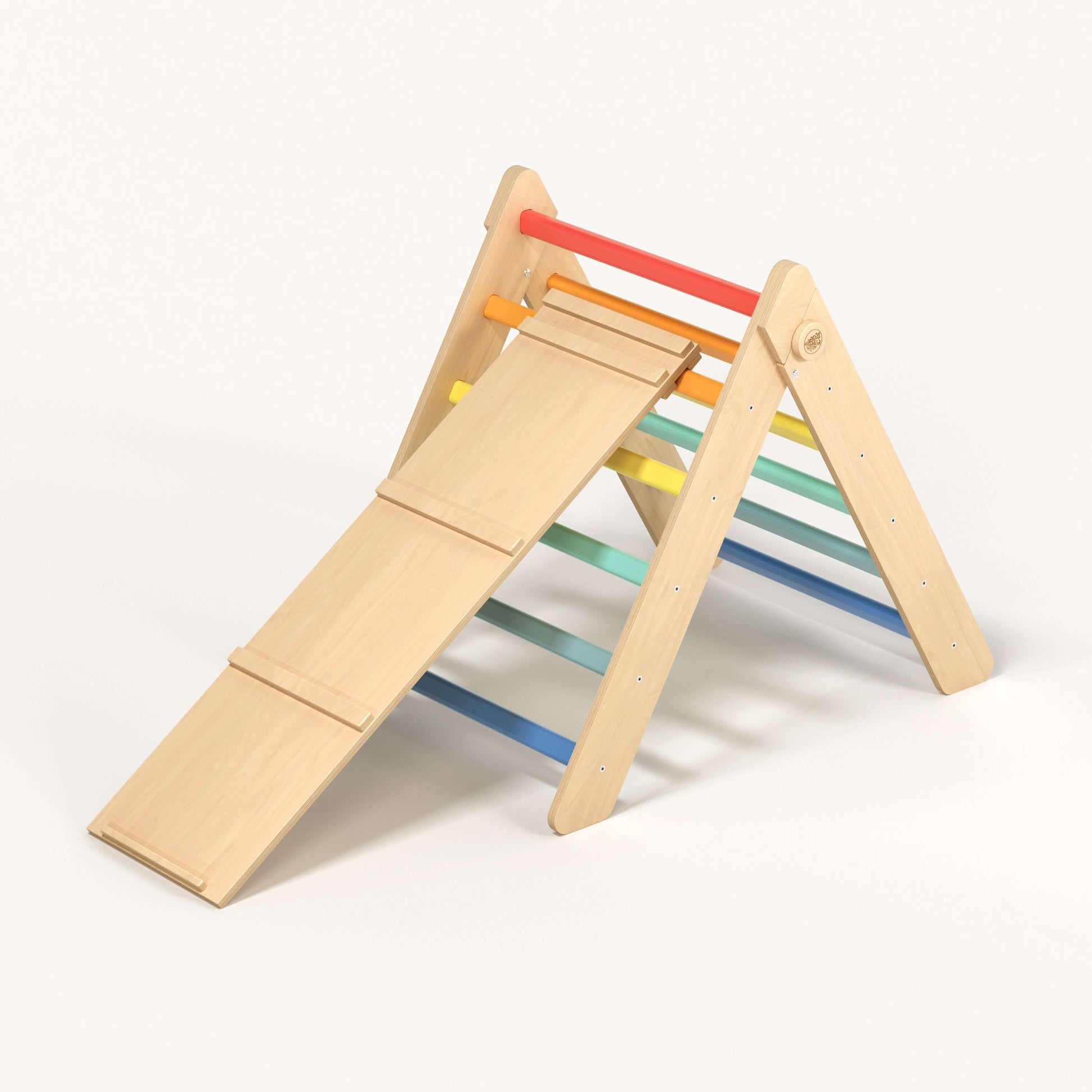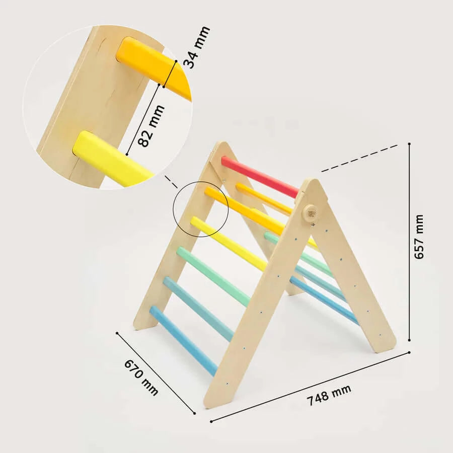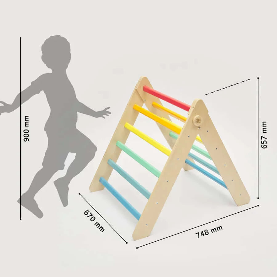 • Die Sprossen am Kletterdreieck sind in den Farben des Regenbogens / Mint gehalten. Die Oberfläche ist mit ungiftigem Lack behandelt, der auch für Kinder sicher ist.