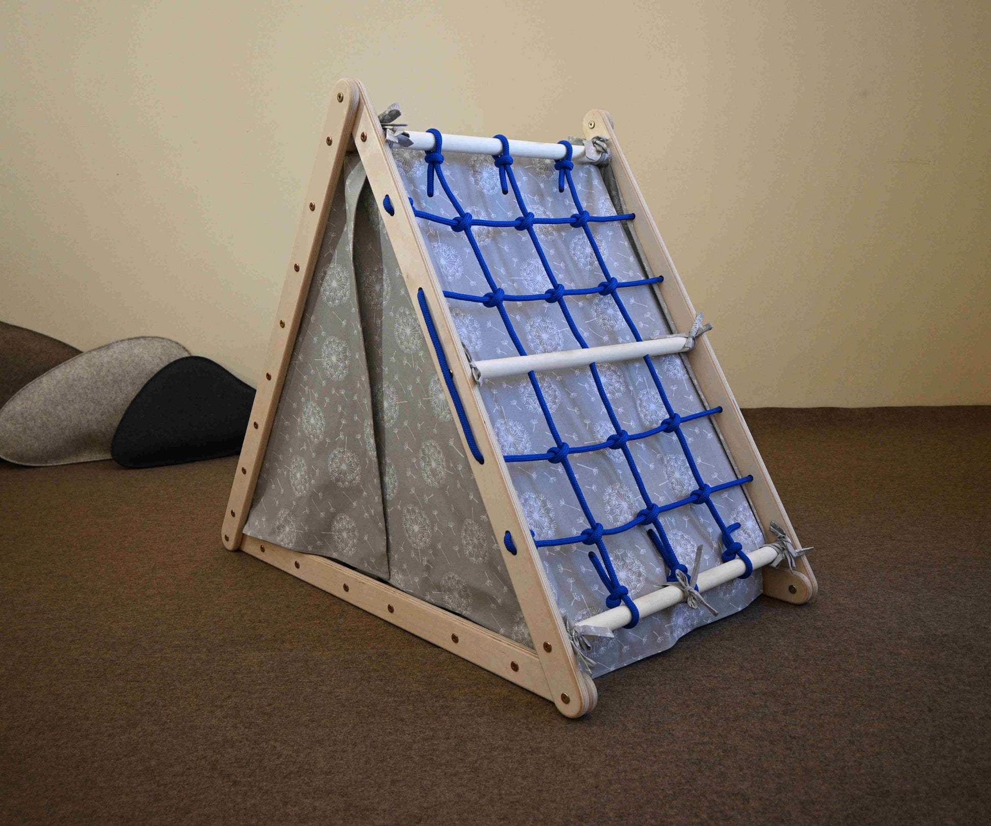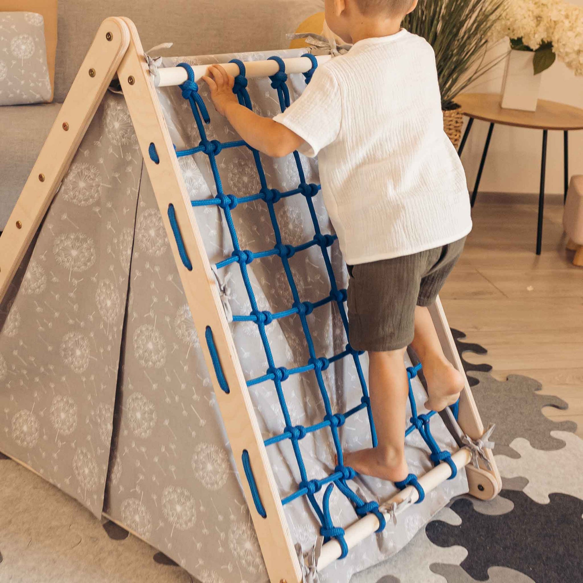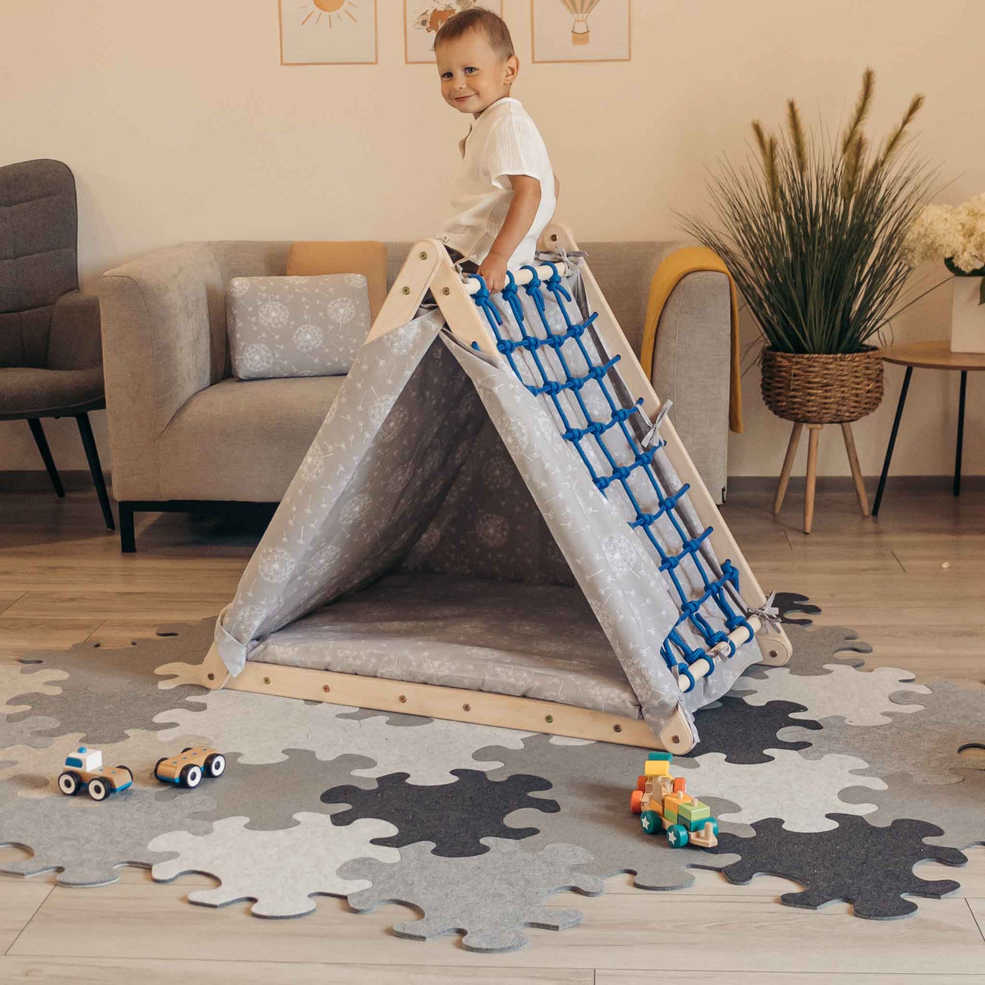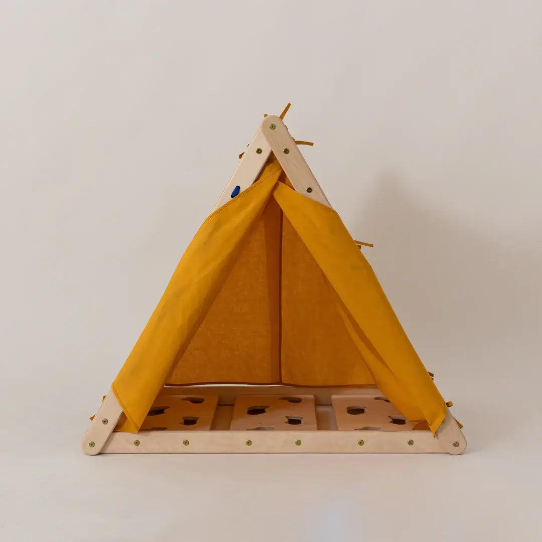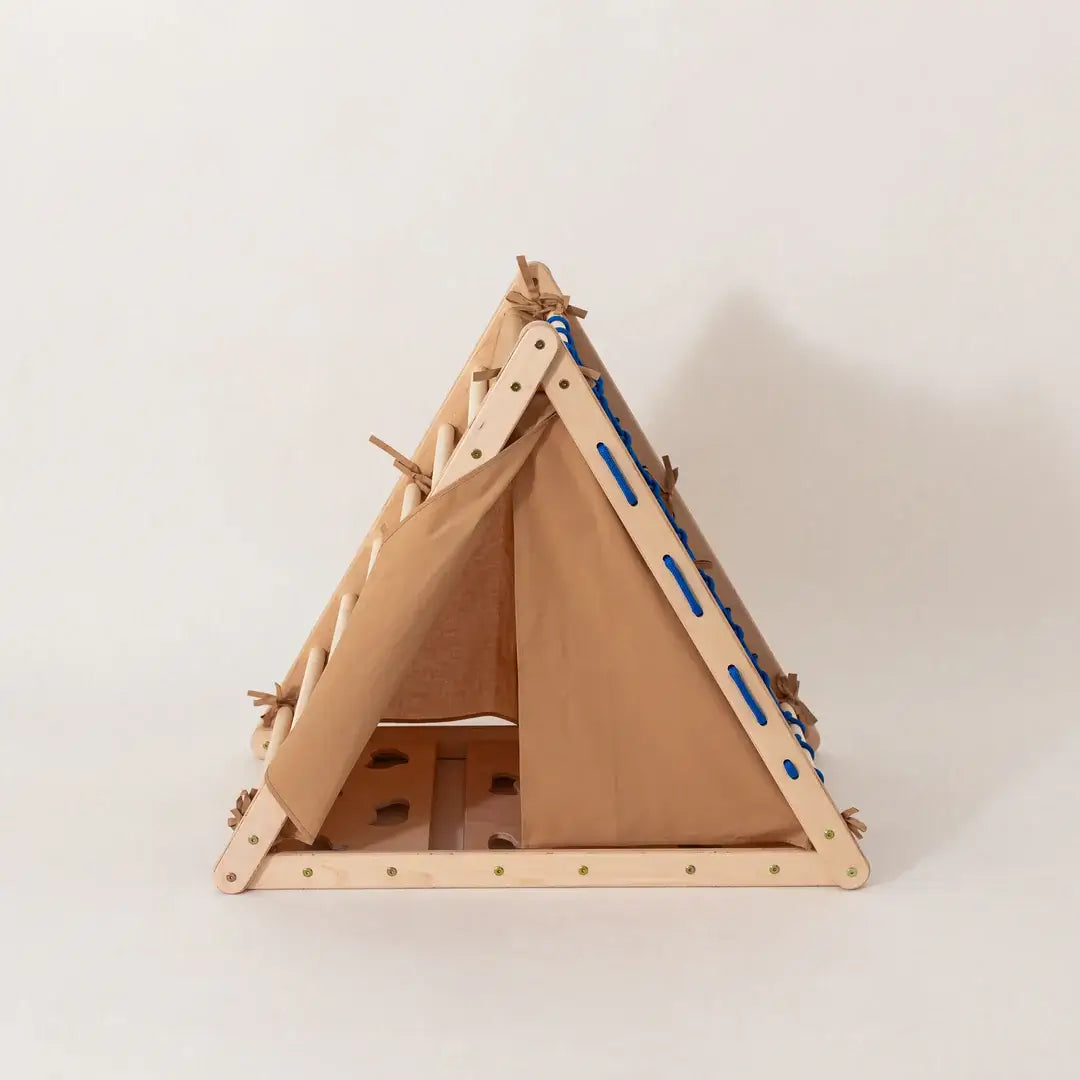 Du kannst das Zelt entweder über das Kletterdreieck stülpen, wenn du es wie ein Zelt benutzen möchtest, oder du kannst es mit der Innenseite verbinden, damit dein Kind auch weiterhin das Kletterdreieck benutzen kann.